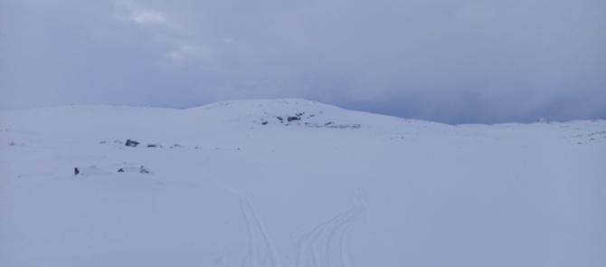 Ну а пока поднимаюсь по долине ручья. Забираю немного на Север, поскольку на Юге по топокарте показаны зелёные зоны кустов. Встречаю буранку. Наверное недавно, вчера или позавчера кто-то проехал, поскольку она не занесена снегом. Обрадовался. Повезло ведь! Но, пройдя по ней около перехода, понимаю, что она поворачивает не в ту сторону, что мне нужно. И приходится уходить с неё. Сам же выхожу на холмы тундры, и иду по ним. Леса здесь нет, а вот если глядеть на Юг или далеко вперёд, то видны уже холмы, поросшие лесом в виде берёзы, а кое-где видны уж хвойные: сосны и ёлки. Впереди показался массив Ловозёрских тундр. Отсюда, до них километров 45…50 по прямой. Красота! Радикальное изменение окрестного пейзажа. Ведь пару дней назад на Юге была видна лишь Кейвская гряда, где голая, где поросшая лесом, ну а тут прям ГОРЫ-ГОРЫ. В начале похода было пасмурно, и я не насладился видом этого массива, а вот теперь я вижу суровые горы Севера во всей красе!