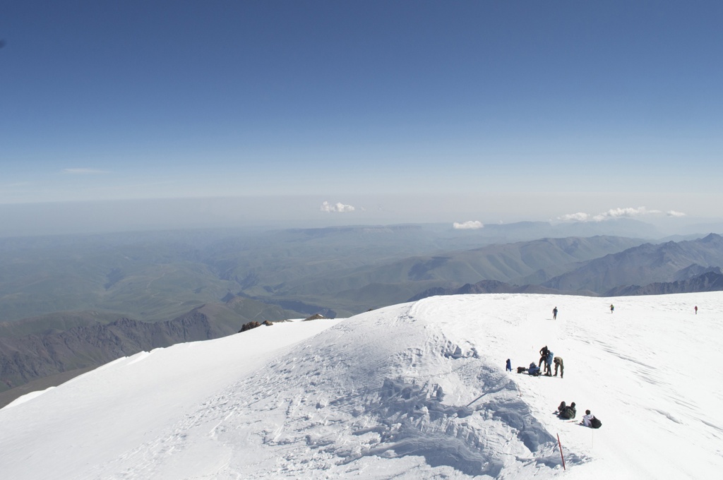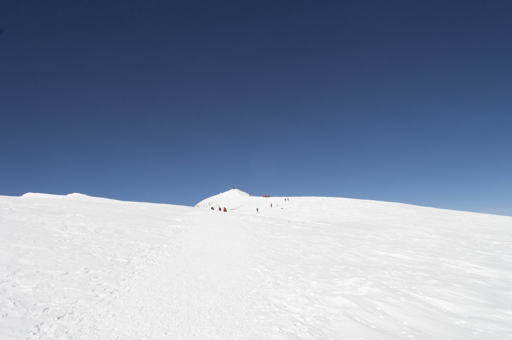 Едва альпинисты обустроились в гостинице «Приют-11», как накрыла непогода, продолжавшаяся неделю. Продукты подходили к концу. Отряд разделился на две группы. Первая из них 14 февраля, в условиях снежного бурана и видимости в 10 метров, успешно взошла на Западную вершину Эльбруса. Альпинисты сбросили находившийся там потрепанный немецкий флаг и установили новый, советский. На долю второй группы, направлявшейся на Восточную вершину, выпало не меньше испытаний. Спустя три дня буран утих, но мороз усилился до 40 градусов. Вот что говорит А. Гусев: «Дул порывистый ветер силой 25 – 30 метров в секунду. В воздухе над склонами неслись ледяные кристаллы, которые иглами кололи лицо. А нам надо было подняться над «Приютом» еще на 1400 метров. На вершине же, как мы понимали, мороз мог превышать 50 градусов. Такая обстановка заставляла серьезно позаботиться об одежде. Тулупы были тяжеловаты для восхождения, но зато надежно защищали и от холода и от ветра. Маски на шерстяных шлемах, надетых под армейские шапки-ушанки, должны были предохранить от обморожения лица. На ногах у всех были валенки». Чтобы сократить время, участники восхождения пошли не через седловину, а напрямую по гребню. «Эльбрус заблестел зеркально отполированными ледяными склонами. Даже острые «кошки» порой скользили по нему, как по стеклу. На крутых местах шли серпантином: то левым, то правым боком к вершине. Долго двигаться одним «галсом» было невозможно: «кошки» на неподшитых валенках начинали сползать набок. Идти становилось все опасней, а останавливаться нельзя — мороз усилился, замерзнешь».