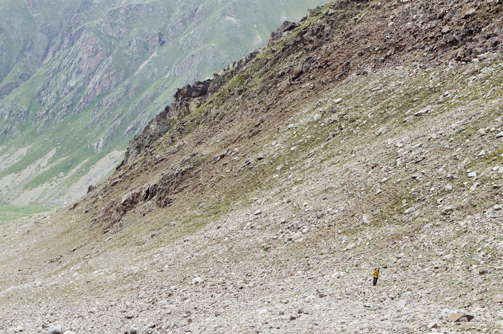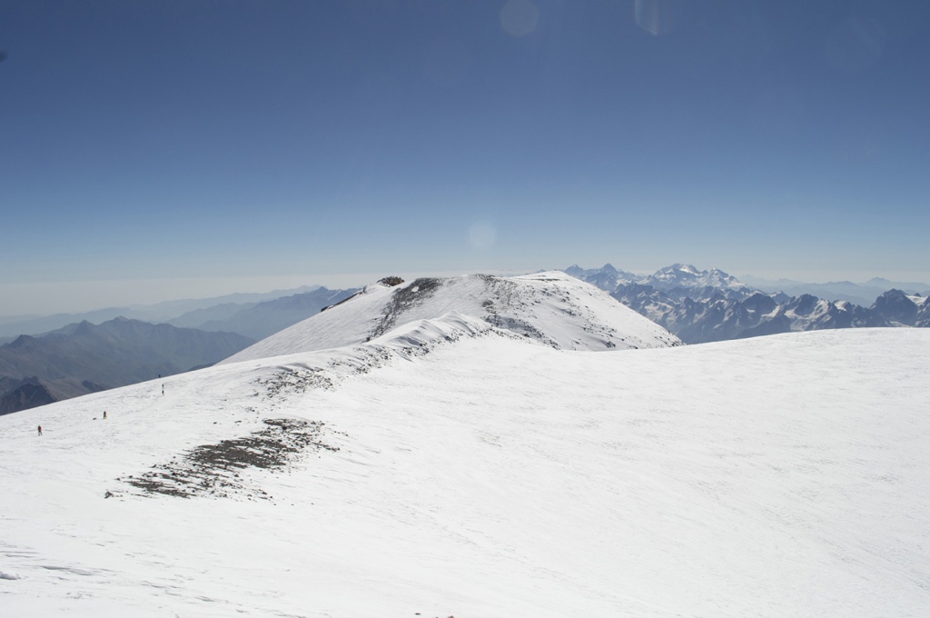 На высоте 4050 метров в 1938 году была построена первая в Советском Союзе высокогорная гостиница «Приют-11», на тот момент она имела статус самой высокогорной в Европе. По уровню комфорта ее называли «Отель над облаками». Для противодействия ветру 3-х этажная гостиница была овальной формы со скругленной крышей, а деревянный каркас обит оцинкованными железными листами. В мирное время строили ее не только советские инженеры, но и немецкие специалисты. Для захвата высокогорной гостиницы и установления контроля прохода к Эльбрусу была сформирована группа под командованием гауптмана Хайнца Грота из 120 человек. Грот хорошо знал склоны Эльбруса и даже был знаком с некоторыми советскими альпинистами. Рассказывают даже, будто Грот специально оставил своих егерей на перевале Хотютау и безоружный, с белым платком в руках, в одиночку поднялся к «Приюту-11», где находился начальник метеостанции Ковалев, его жена метеоролог, радист и три разведчика. Он сказал, что берет их в плен, но по старому альпинистскому знакомству отпускает. Так рассказывал сам Грот, но эта версия вызывает большие сомнения. По нашей версии, отряд Грота, спустившись с перевала Хотютау, разделился на две группы, одна из которых пошла к станции «Старый Кругозор», а вторая направилась к «Приюту-11». Заметив перемещения немецких егерей, наши зимовщики и трое разведчиков, взяв с собой наиболее ценное оборудование, спустились в поселок Терскол. Как бы там ни было, группа Грота заняла гостиницу без единого выстрела. В своем походе вокруг Эльбруса мы были на Хотютау. Ниже фото с этого перевала, сделанные в 2016 году: