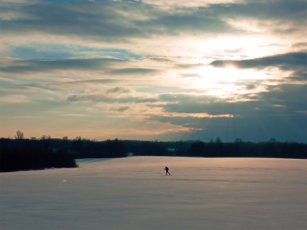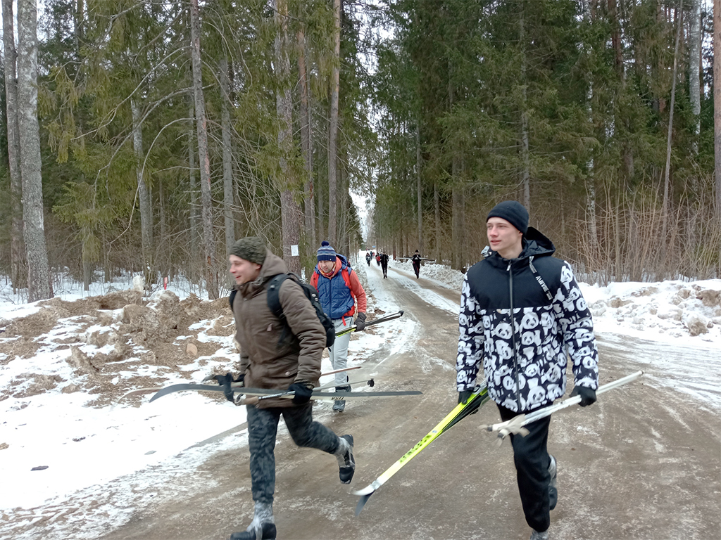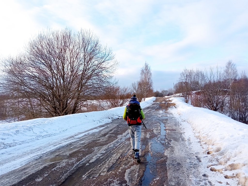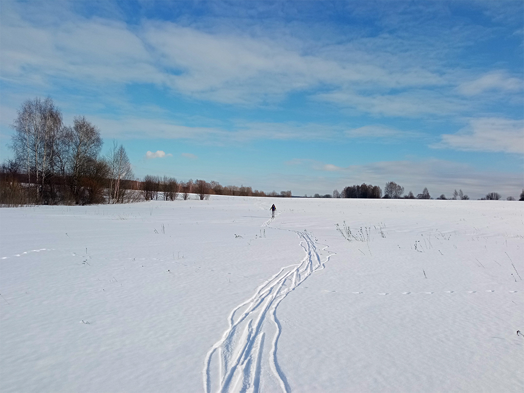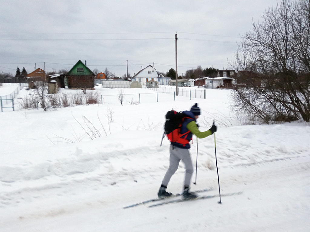 Сначала все бежали по асфальту с лыжами в руках. За спиной рюкзаки с термосами, перекусом, теплой одеждой и скотчем. Пробежав в лыжных ботинках с полкилометра до развилки, «обулись» и коряво покатили по обледеневшей дороге. И только сняв лишнюю одежду у первой кпшки и выйдя в поля, начали реализовывать свой потенциал. А если убрать красивые определения, то по факту, мой организм ахренел с первых же сотен метров. В моих представлениях, мы должны были беречь силы и не устать еще в самом начале. Как я ошибался. Серега, настроенный на полное уничтожение соперников, даже и не думал снижать темпа все 12 часов.