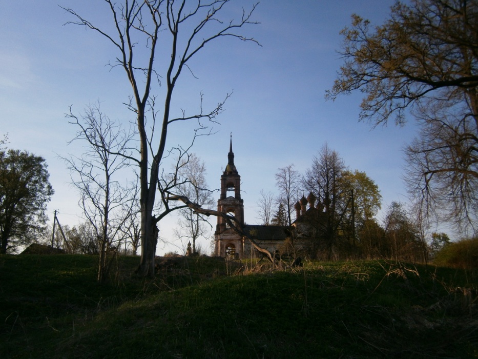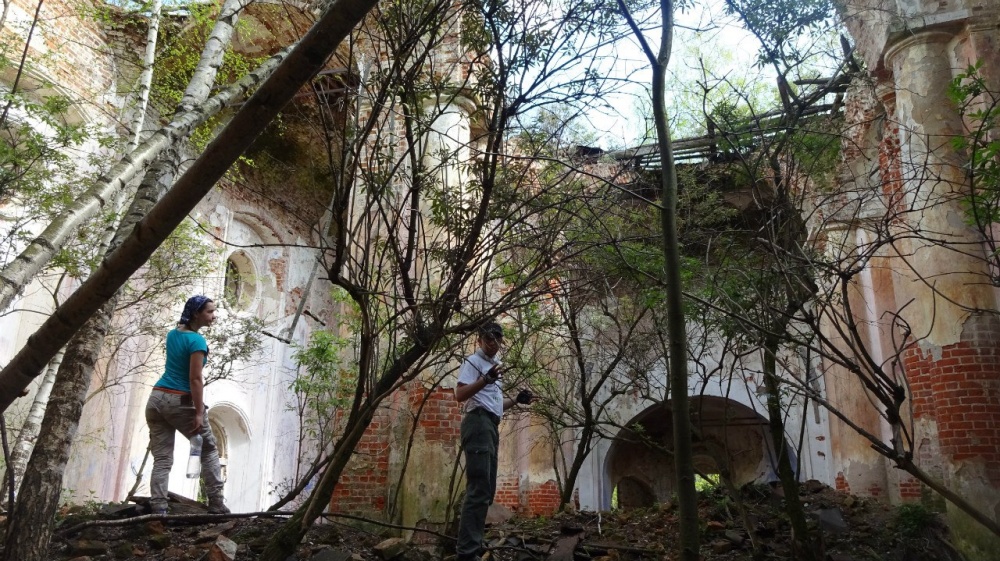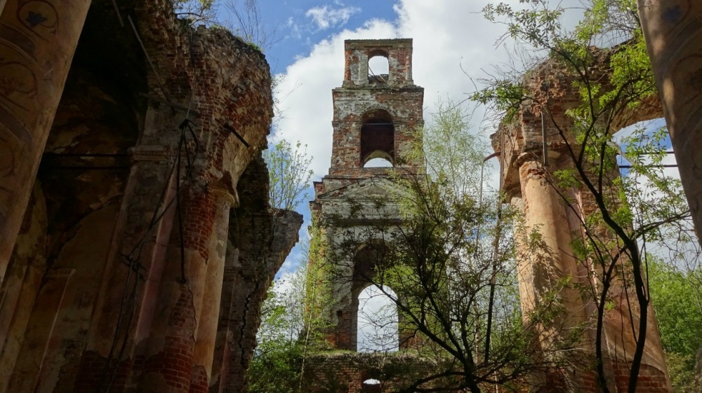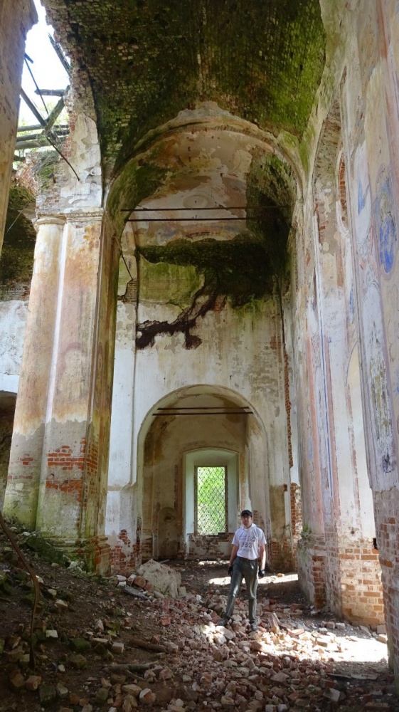 6 мая. После завтрака собрались и сразу же, не заезжая в Нерехту, выехали на дорогу на Волгореченск. Дорога плохого качества, гравийная с ямами и неровностями. В этот день первое и, пожалуй, самое интересное за весь поход место, которое нам удалось посетить — полуразрушенный храм в с. Есипово. Добрались туда таким образом: проехав Марьинское, свернули на Панино и через Клетино выехали к липовому лесу. В гуще этого леса зарастает и разрушается чудесное здание храма Троицы Живоначальной. Осматривали храм долго, любовались красотой его архитектуры и фресок. У храма обвалилась крыша и изнутри он озарялся лучами солнца как руины некогда величественного строения. Фотографии получились довольно атмосферными.