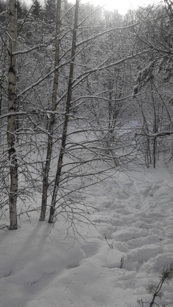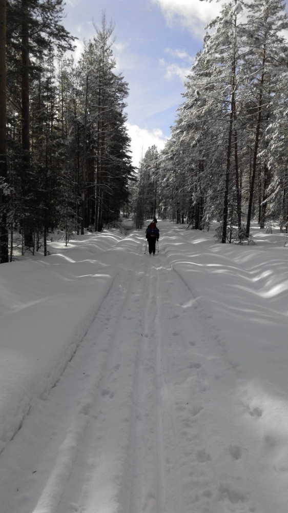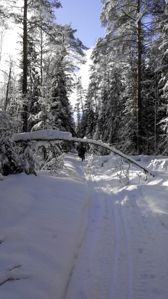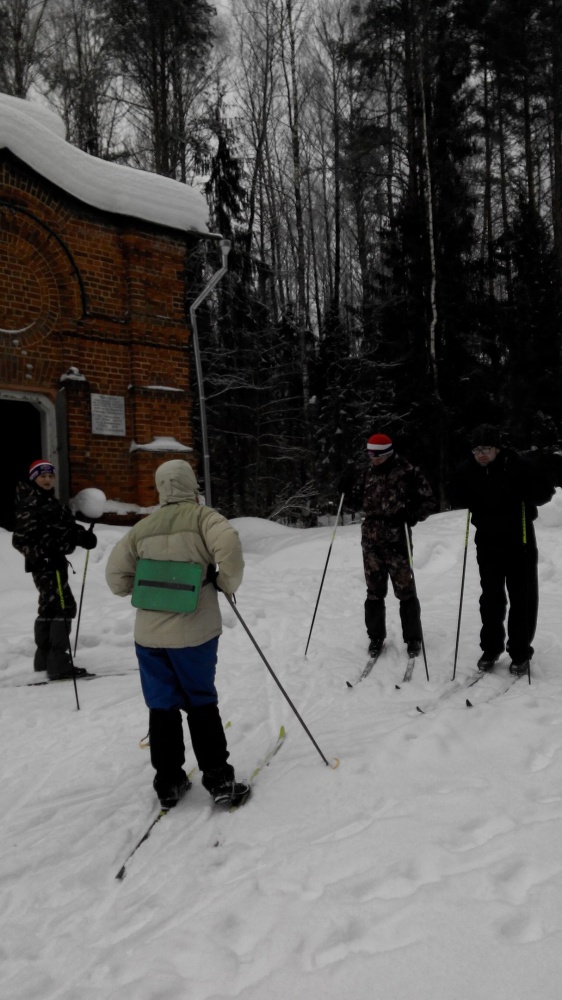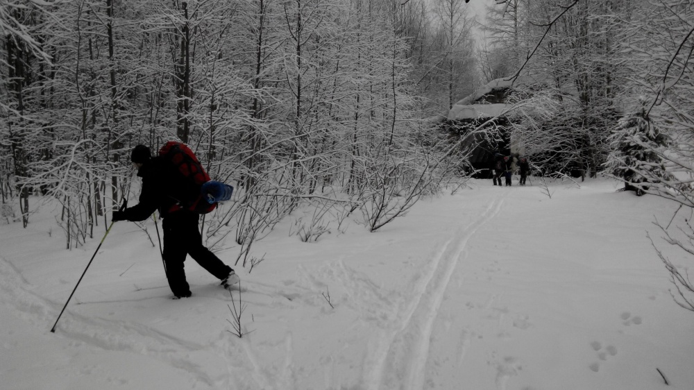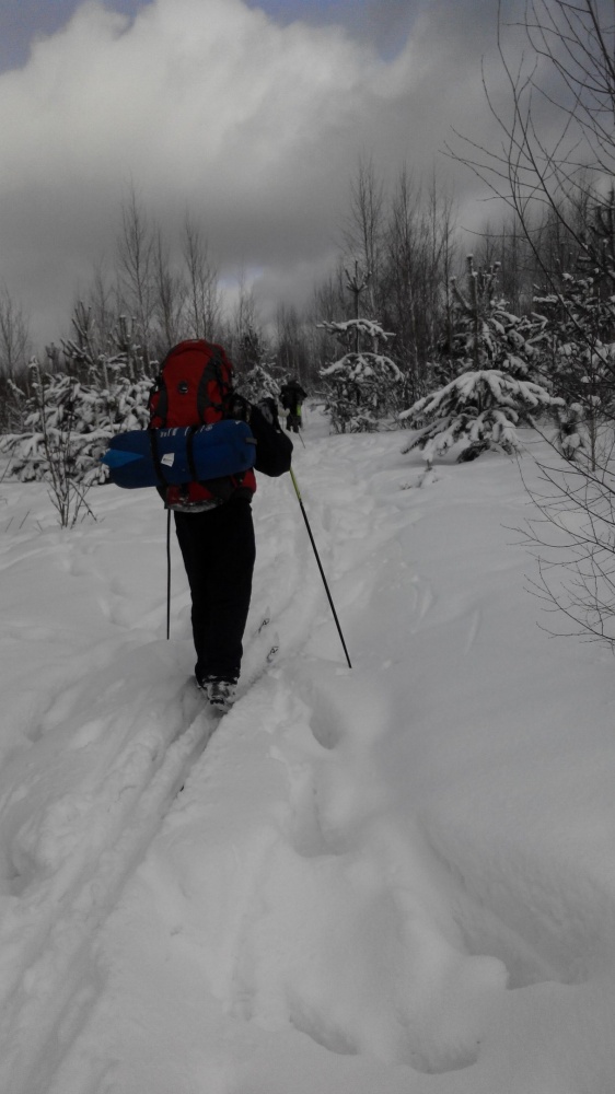 24.02.17. Выход в 8:00. Мимо церкви Воскресения Христова дорога ведет вниз к д. Ченцово. Совсем близко от нас, когда мы отдыхали на привале, пробежала лисица. Оттуда по азимуту, через поле, вышли к п. Солнечный. Далее, мимо шлагбаума к заброшенным военным ангарам. Они повсюду в лесу. От них двигались по азимуту через лес в д. Медведки. Вышли удачно. В Медведках при выходе из деревни встали не на ту дорогу, пришлось сделать крюк. От Медведок по расчищенной трактором автомобильной дороге вышли прямо в д. Кишино. Из Кишино попытались выйти на мост, с двух попыток нам это не удалось, и группа встала на ночлег в сосновом лесу на берегу р. Андоба в 18:00. Снега очень много, за Кишино, в молодом сосняке полно глубоких лосиных следов и лежек. Пасмурно, но тепло. В лесу очень красиво и спокойно. Ночь прошла хорошо, никто не замерз.