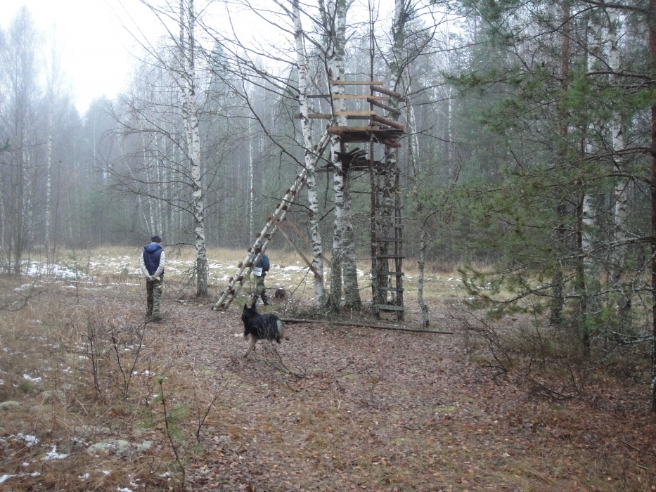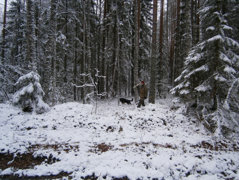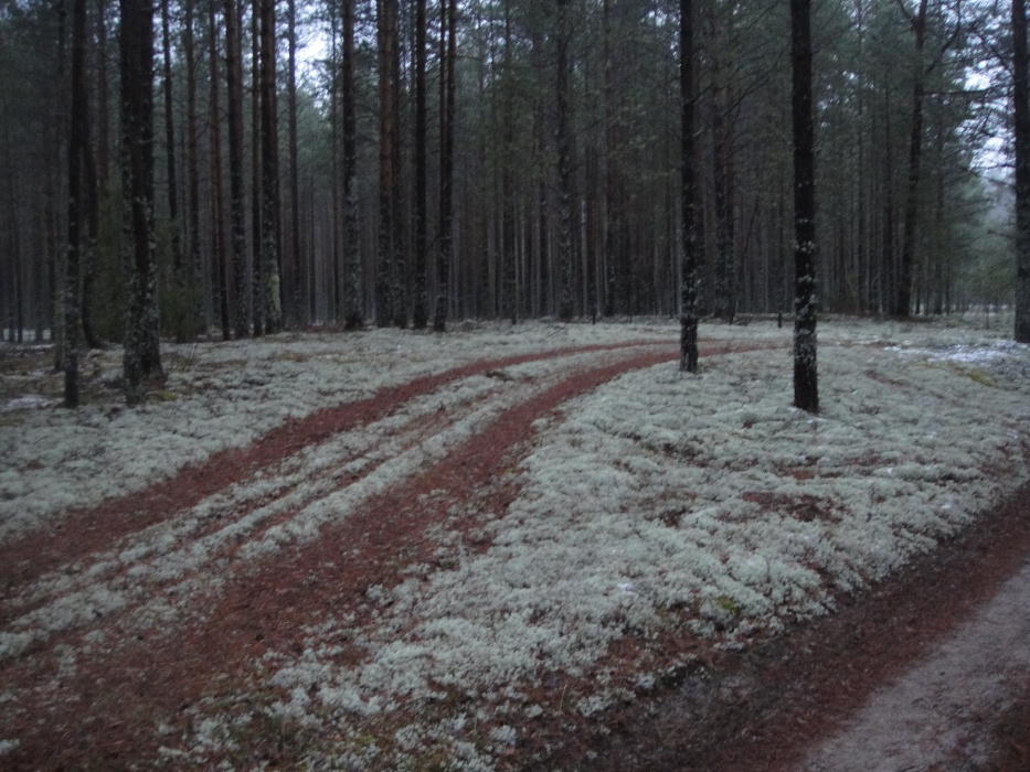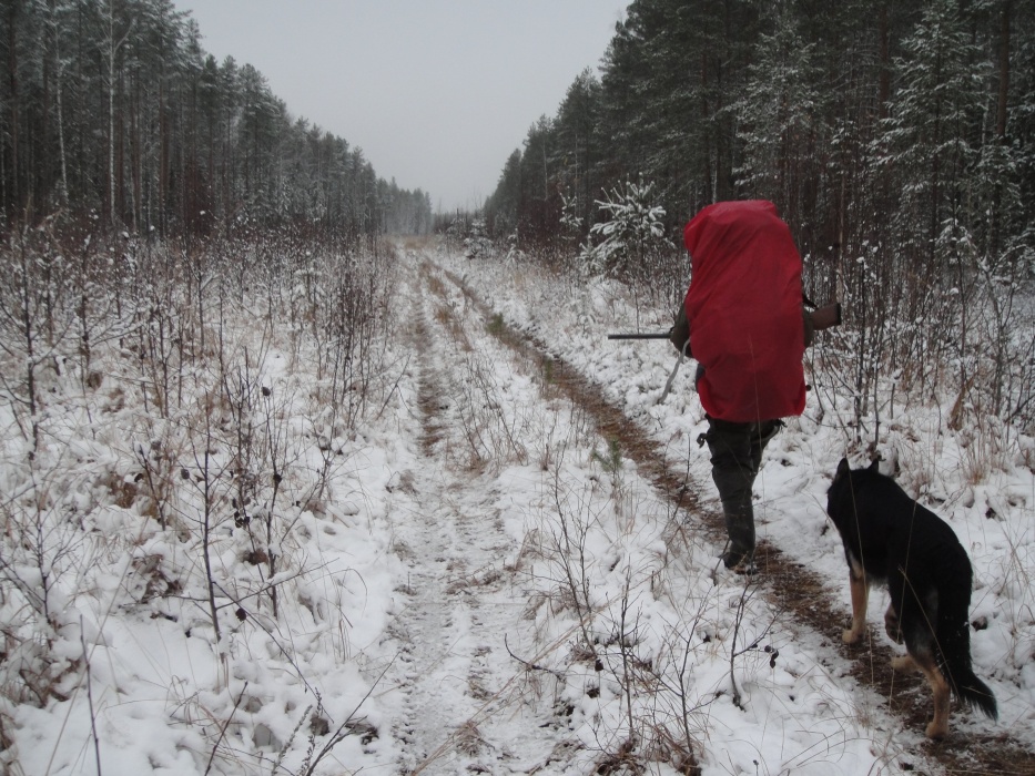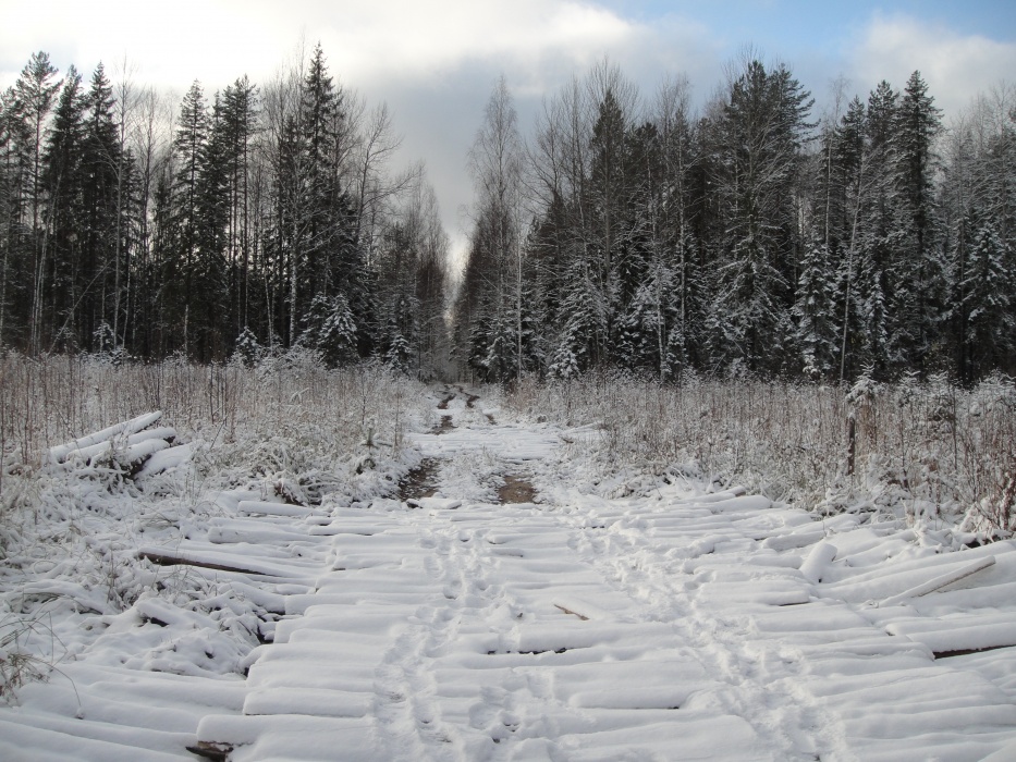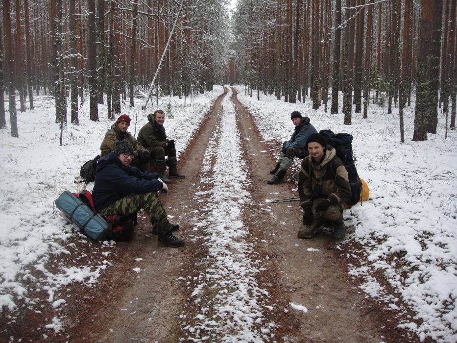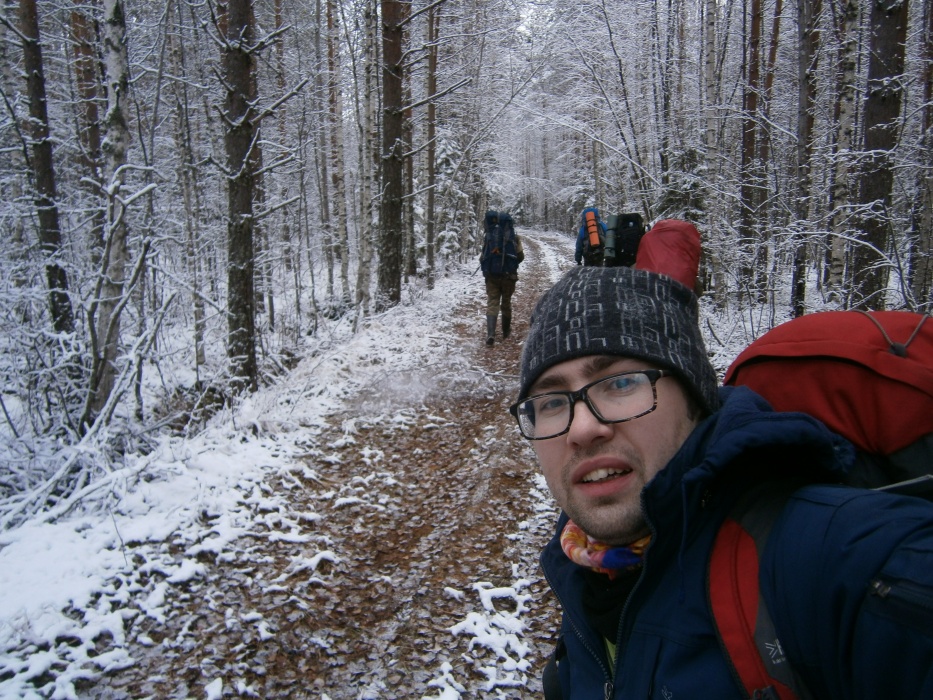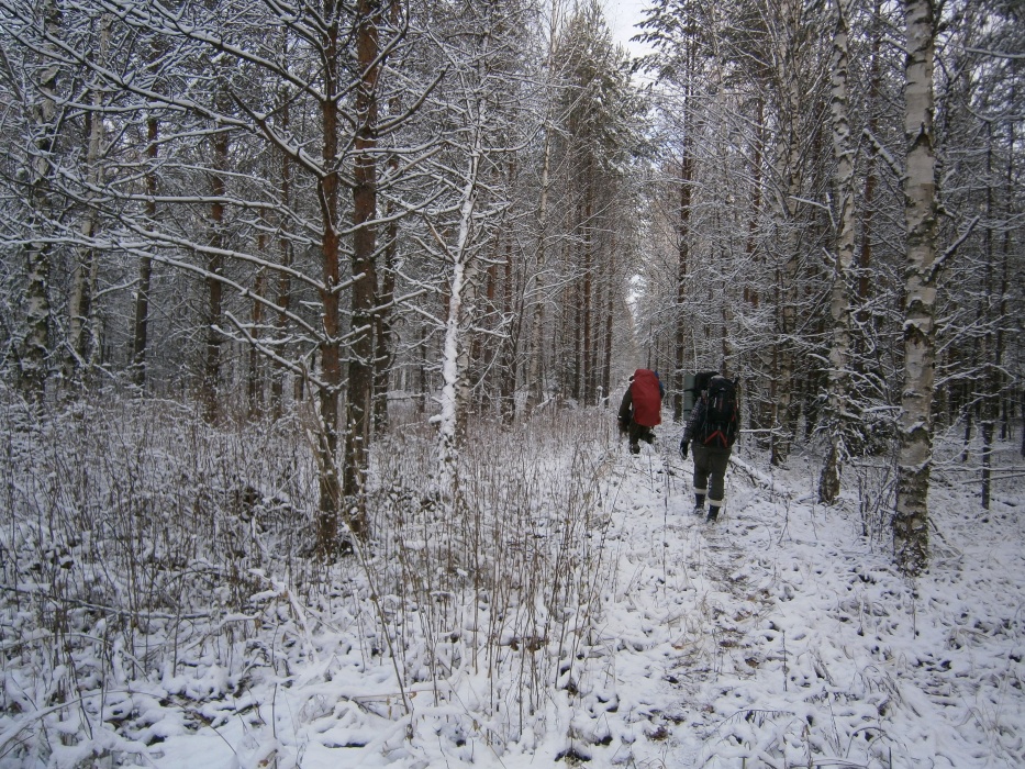 По широкой грунтовой дороге дошли до узкоколейки. Далее по ней, шли довольно долго, то спускаясь на параллельно идущую дорогу (видимо накатанную охотниками), то возвращаясь на насыпь. В одном месте небольшой отрезок насыпи зарос деревьями и затерялся. По бокам часто стоит вода. На улице небольшой минус, поэтому не очень сыро. А вообще места довольно болотистые. По этой наши планы на второй день слегка поменялись.