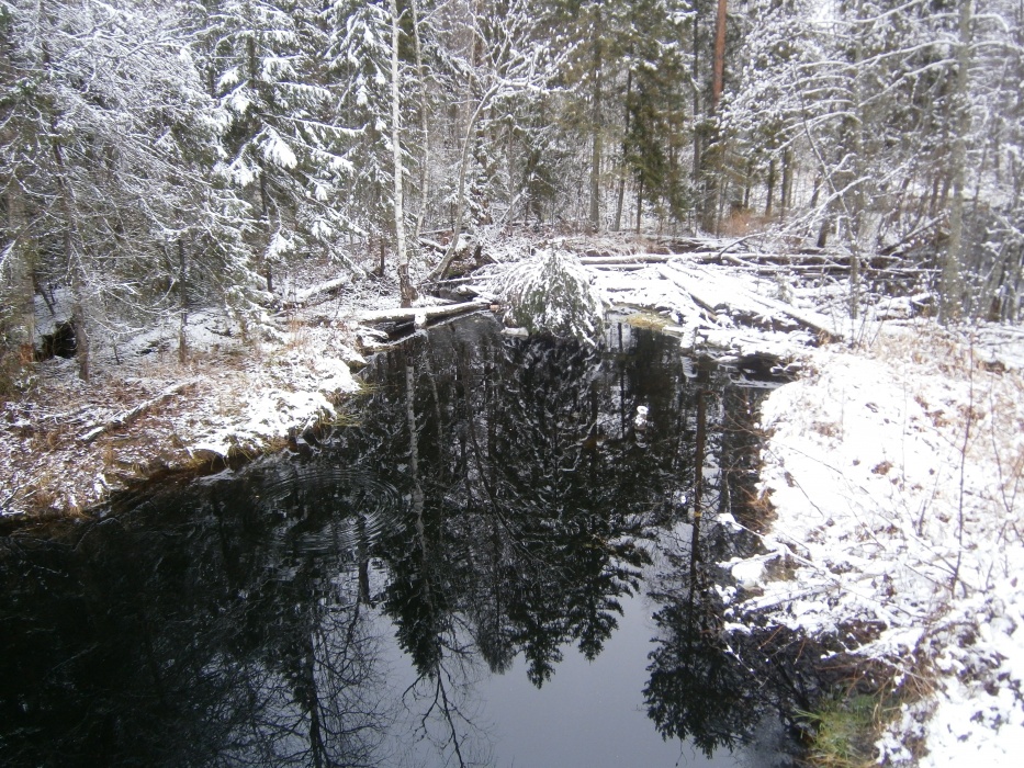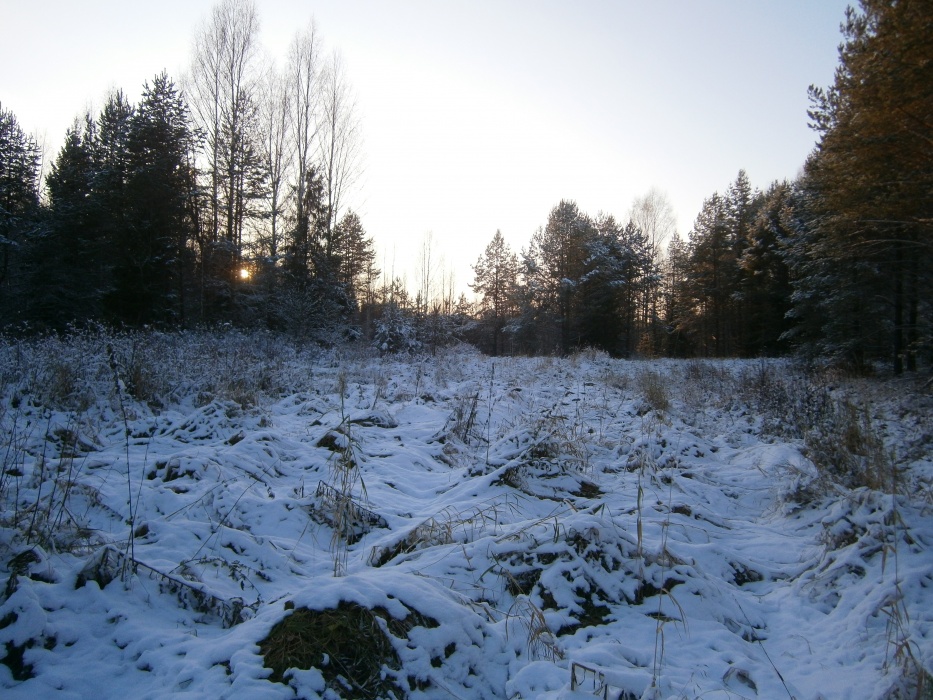 Второй день. Вышли рано. Немного вернулись назад и свернули налево. Спустя 3-4 часа вышли на главную дорогу. Пока выходили, встретили лесника. Он посоветовал идти к речке Белый Лух. Мы его послушали и не прогадали. Дойдя до Томши и пройдя 50 метров после моста, свернули направо. Живописная ровная тропа вела нас среди соснового леса. Заснеженный и светлый, он завораживал своей красотой и изумлял гладким и чистым рельефом. На следующей день снег растаял и мы увидели, что повсюду под снегом скрывался мох. Пройдя в этот день всего 15 км, в обед мы уже были на месте, которое представляло из себя красивую подготовленную для стоянки площадку на берегу реки. Вечером стало совсем тепло и снег, так красиво покрывавший лес, стал таять. Капли талой воды повисали на еловых ветвях, как ягоды, и, набрав вес, падали в костер. В этот день у нас получилась полудневка.