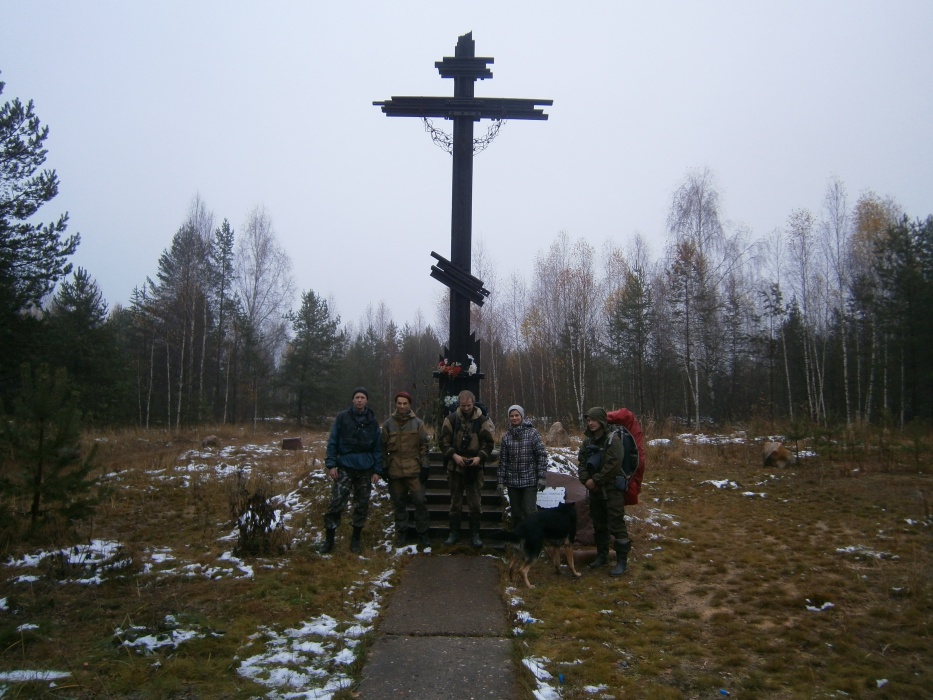 Последний день похода был теплым, но мокрым. По пути назад посетили поклонный крест — первый в этих местах памятник жертвам исправительных лагерей. Он был установлен и освещен 30 августа 2009 г. Проект разработал костромской архитектор Федор Иванов. Идея памятника проста — это канонический Поклонный крест, сориентированный по сторонам света согласно православной традиции. Материалом послужили рельсы бывшей узкоколейки, соединявшей лагеря – они до сих пор сохранили клеймо 40-х годов с именем Сталина. Крест стоит на рукотворном кургане, в основании которого лежат несколько камней. По задумке, паломники, приходящие к кресту поклониться, будут оставлять здесь камни, формируя тем самым связь с этим местом. А на самом кресте — венок из колючей проволоки. На карте, место, где стоит крест обозначено как «ур. Смолзавод». Судя по всему, это было одно из мест, где трудились узники Унжлага.