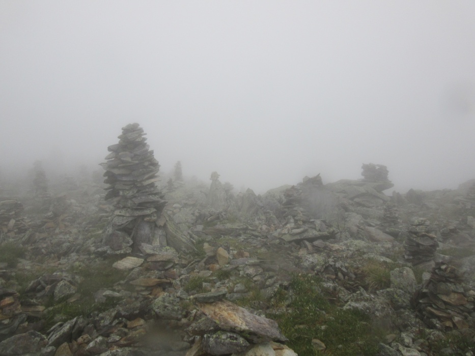 Тем временем небо хмурится, на озёра опускается тёмная туча. В 15:30 выдвигаемся далее в путь. Поднимаемся по каменистой тропе через лес. Вокруг туман. В этой дымке, как нечто сказочное, показались многочисленные туры перевала Багаташ. Густой туман, сильный ветер, начавшийся холодный дождь и гром предают особый колорит этому месту. Погода нас не пугает, погрузившись в сказочную атмосферу, мы бродим среди туров разных размеров и форм - многие туристы считают своим долгом оставить здесь своё сооружение.