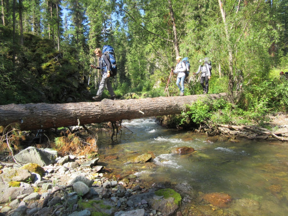 27.07. Первый день. В 07:00 автомобиль ЗИЛ-131 прибыл и за два часа по бездорожью доставил нас к месту старта – устью реки Тура. Подъем, довольно крутой, представляет собой тропу через лес с переходом по камням, или по бревну реки Тура. Первый подъем дается нелегко, за 6 часа поднимаемся к нижнему озеру. Против наших ожиданий, стоянка свободна и денег за нее не берут. Было принято решение вместо днёвки 28 июля сделать две полуднёвки 27-28 июля, но зато остаться на удобной стоянке и не разбивать лагерь на перевале, как планировалось изначально. Погода стоит солнечная.