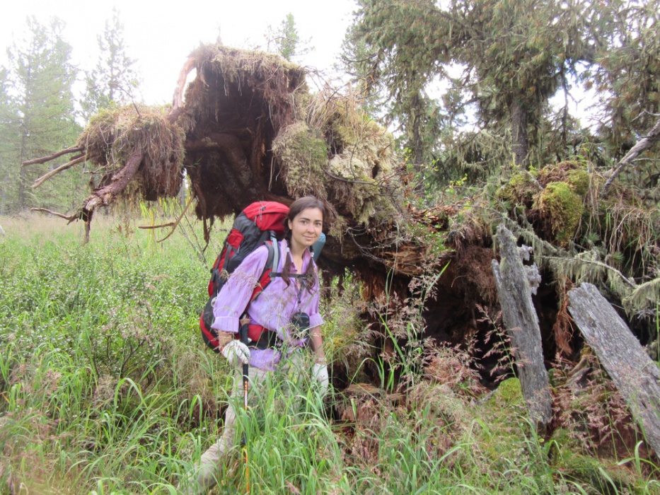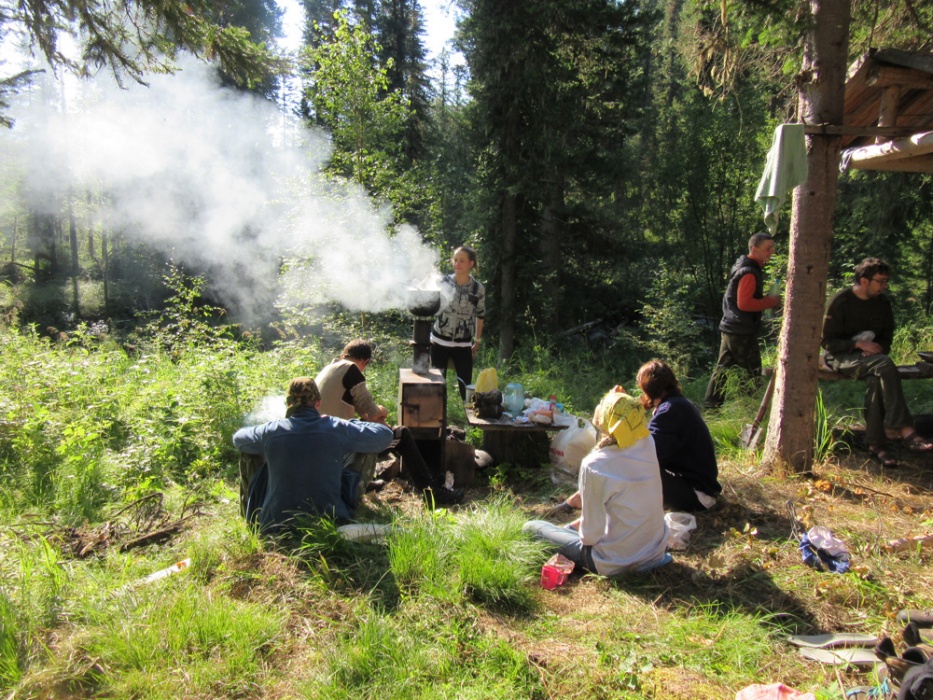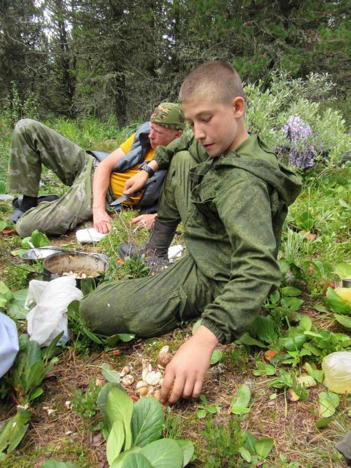 03.08. Пасмурно. Поднимаемся через кустарник, бурелом и стланик в направлении г. Турга. Проход по камням средних размеров. Выше уровня камней попадаем в кедровый лес. Радиально выходим на гору, с которой открываются великолепные виды. Пока несколько человек остаются готовить обед (опять же с жареными грибами), остальные совершают подъем на Сумультинский хребет. После обеда спускаемся в долину реки Турга. Мшаник, болото. Множество ручьев, высокотравье, стланик, скрытые в траве неровности рельефа, болото. Местами бурелом. Встали в долине р. Турга в 20:00.