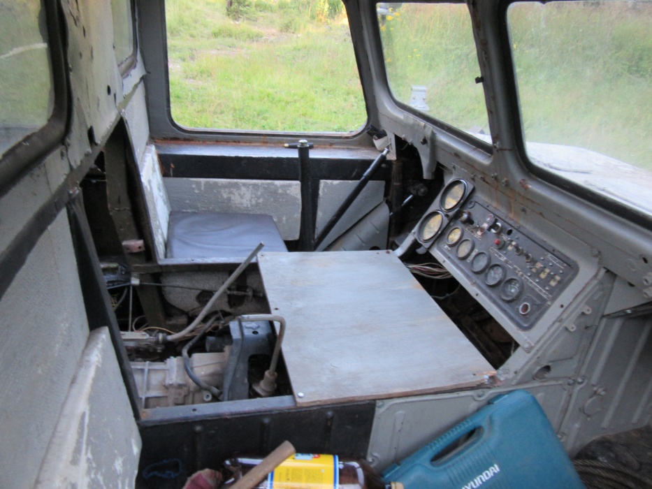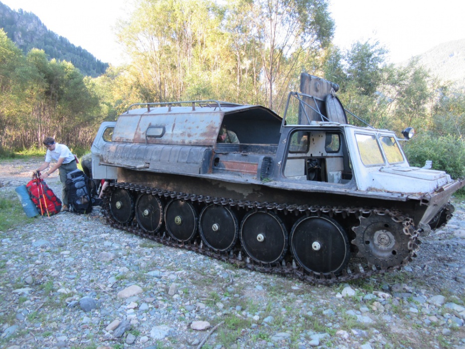В 17:40 выходим к р. Уймень. Оценив брод, делаем вывод, что он предназначен для тяжелых машин, но никак не для пешеходов. Вброд такую бурную и глубокую реку нам не перейти, надо искать место для навесной переправы, так как длины веревок в районе брода нам не хватает. Была отправлена разведка вверх и вниз по течению. Однако, на нашу удачу, к реке подъехал гусеничный вездеход ГАЗ-71, направляющийся за туристами в горы. Это транспортное средство в советское время было спроектировано специально для передвижения по пересеченной местности и труднопроходимым дорогам. Экипаж ГАЗ-71 любезно предложил нам перебраться на тот берег на их вездеходе, на что мы с радостью согласились. На другом берегу, немного вверх по течению реки Ербута располагается конезаводческая ферма, на которой работают в основном алтайцы. Мы решили отойти немного от фермы вверх по течению р. Ербута. Встали в 19:30.