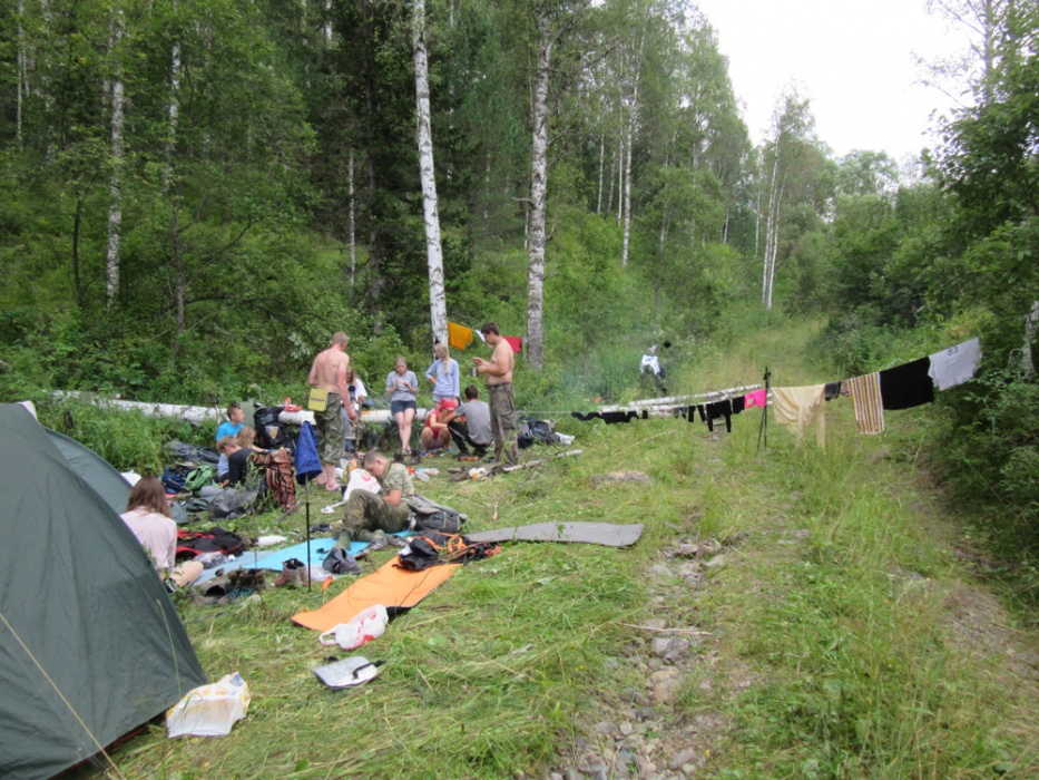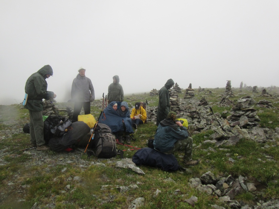 Двигаемся в тумане по компасу. Проходим стланик, мшаник, болото. Через некоторое время спускаемся в кедровый лес, выходим на конную тропу. Двигаясь по ней какое-то время, находим стоянку с оборудованным костровым местом. Все промокшие насквозь, готовим ужин, и готовимся ко сну. К ночи дождь прекращается, что даёт нам возможность посушить одежду и обувь у костра.