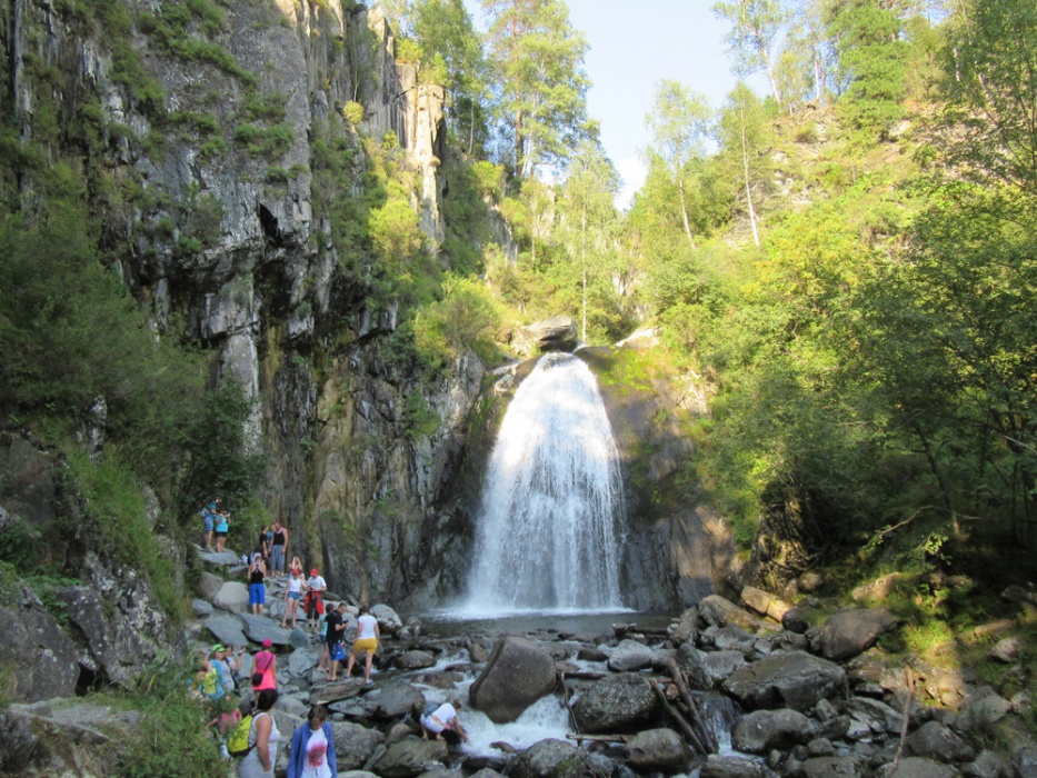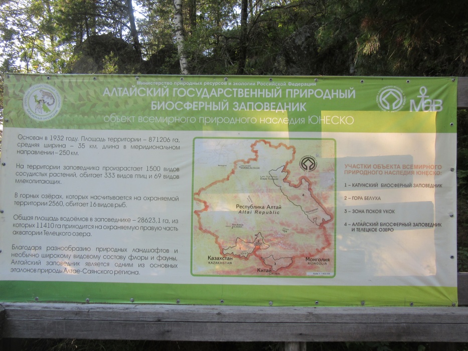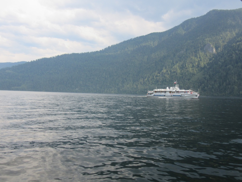 В заключении немного о Телецом озере. По-алтайски — «Алтын-кёль» — самое большое озеро на Алтае и последняя, самая крупная достопримечательность нашего путешествия. Имеет изогнутую форму (почти 90 град) и протяженность 80 км, очень чистое, с прозрачной водой. Глубина в самом глубоком месте достигает 323 м. В некоторых местах озера судоходство запрещено. В России занимает второе место после Байкала по запасам пресной воды. Как рассказал наш гид, если во всем мире закончится пресная вода, то запасов Телецкого озера хватит на 8 лет, чтобы утолить жажду всего человечества! Всего озеро имеет 6 водопадов. Самый большой из них водопад Корбу. Туда привозят практически всех туристов, захотевших покататься по озеру на катере. Поэтому место там оборудованное, с хорошим туалетом, сувенирными лавками и уличными кафешками. Цены вполне приемлемые, кормят вкусно. Так же на берегу озера имеется ботанический сад с экзотическими растениями, а к самому озеру примыкает кратер от метеорита, заполненный водой.