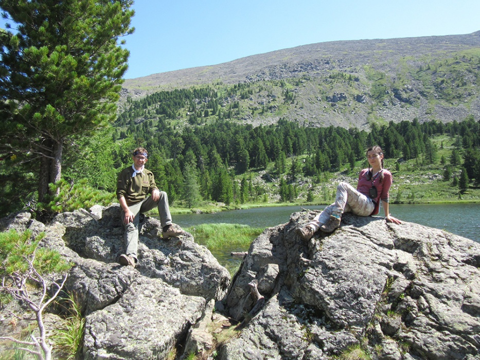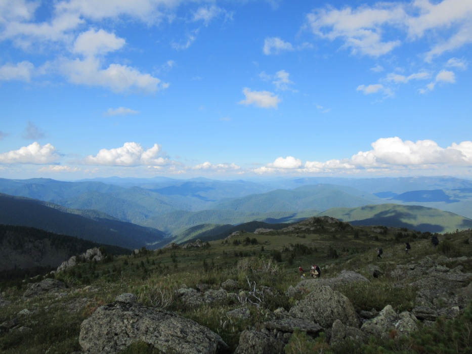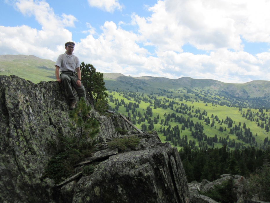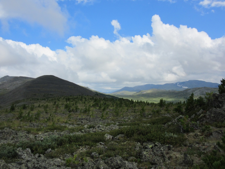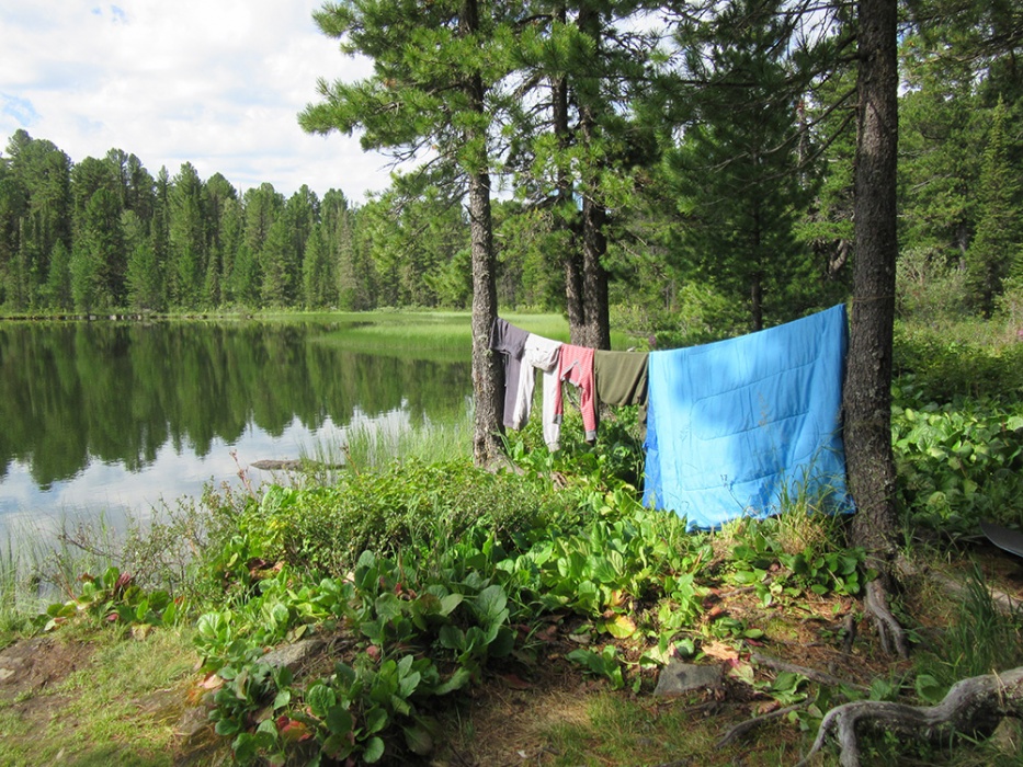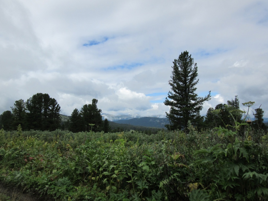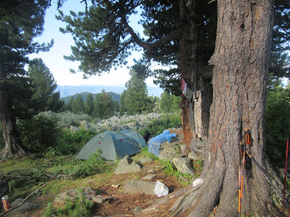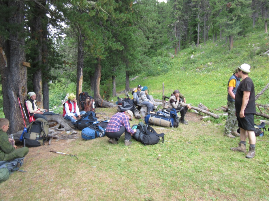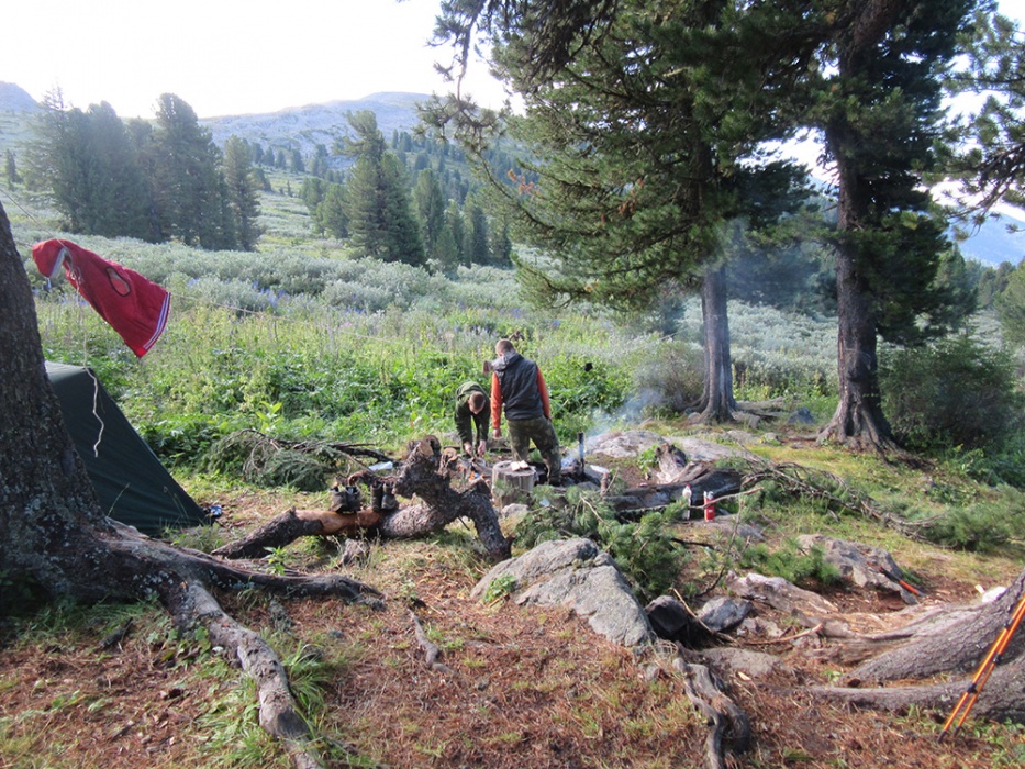29.07. Третий день. Утро выдалось тёплым и солнечным. Просушив на солнышке снаряжение и позавтракав, продолжаем путь по грязной конной тропе, которая некоторое время совпадает с нашим направлением движения. Но потом нам приходится пробираться через заросли, сменяющиеся высокотравьем, перебираться по каменистым участкам. Наша сегодняшняя цель - перевал Аккаинский. Поняв, что мы сбились с пути, было принято решение подняться выше и двигаться по камням. Камни живые, крупные и средние, острые, местами скальные выходы, которые приходится обходить. Какое-то время идём по таким камням по траверсу, далеко внизу видны верхушки кедров. На обед спускаемся вниз к ручью. Затем снова продолжаем подъем в направлении перевала по высокотравью и стланику. Через полтора часа выходим на тропу, идущую на перевал. На перевале оказываемся в 17:15. Он обозначен туром с длинной палкой, к которой прикреплена тканевая полоска с названием перевала. С перевала открывается вид на долинку и озеро. Спуск занял 2 часа. Ночуем у одного из притоков р. Аккол. Стоянка необорудованная. Очень продуваемое со всех сторон место. Этот вечер чувствовался особенно холодным. За неимением дров используем сухой стланик. Греемся горячим ужином, напиваемся горячего чая, расходимся греться по палаткам.