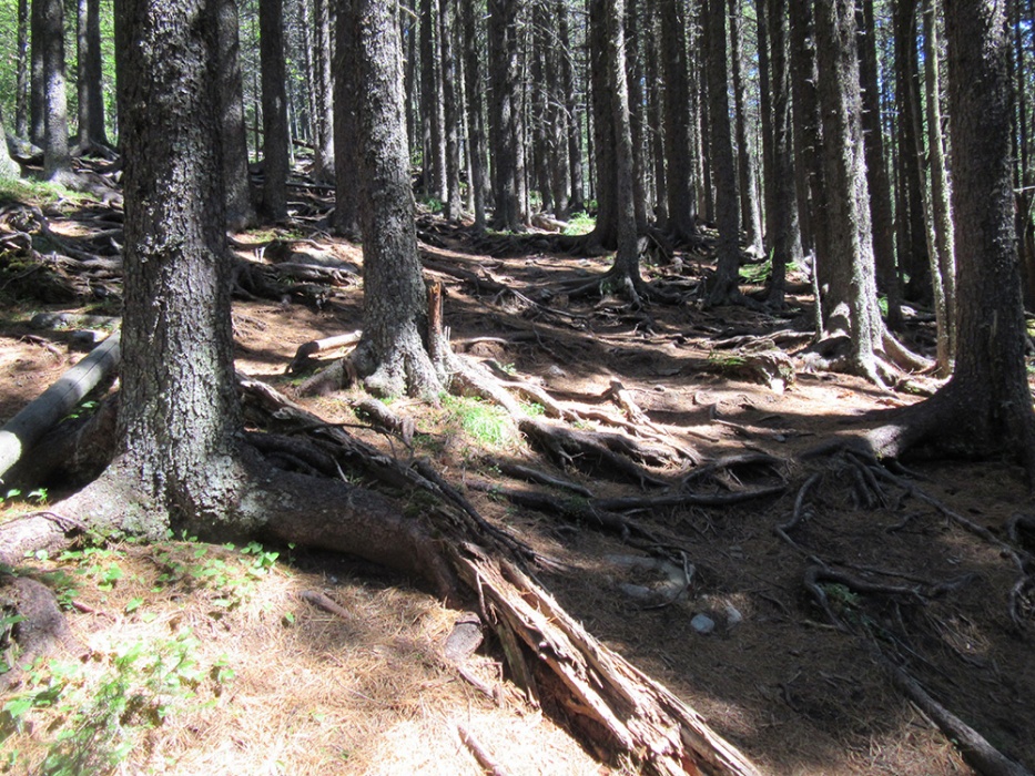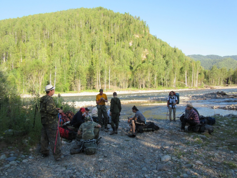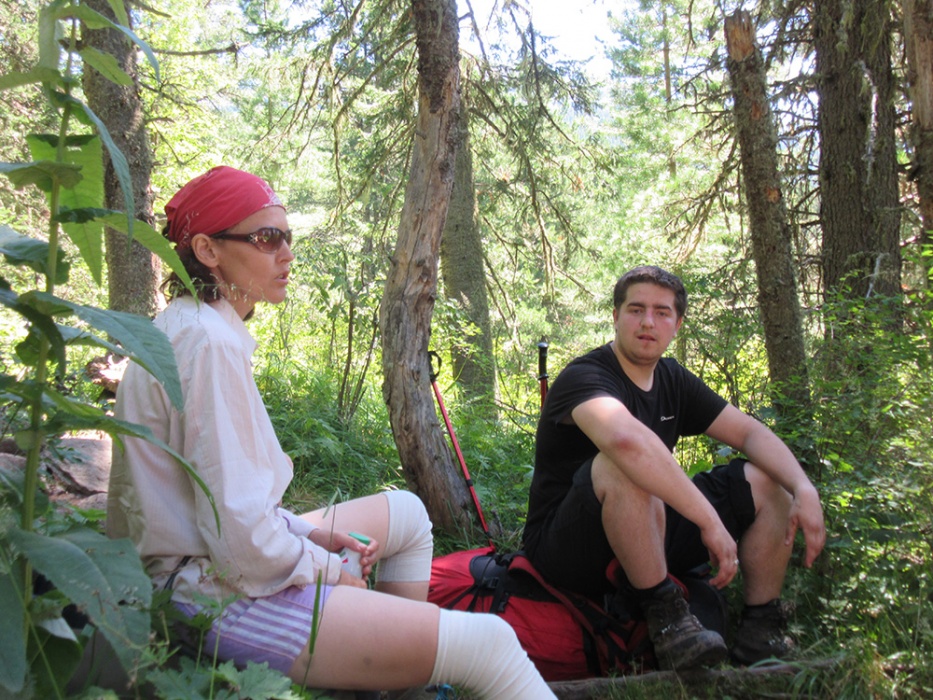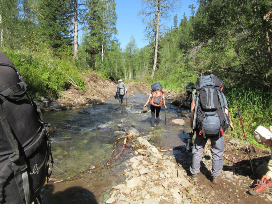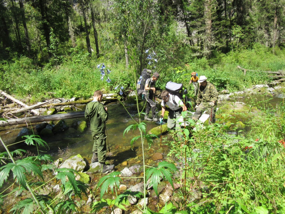 01.08. Солнечная тёплая погода радует. Позавтракав, решаем спускаться в долину реки Косина. Бурелом, спуск крутой, под наваленными друг на друга камнями течет ручей. Местами путь преграждают скальные выходы, приходится их обходить по руслу ручья. Русло труднопроходимо, т.к. заросло кустарником. Несколько раз приходится переходить реку. Местами встречаются звериные тропы. Вскоре, после обеда, выходим на действующую лесоразработку с лесорубами, которые сообщили нам, что до брода через Уймень нужно пройти еще 7 км.