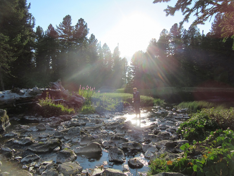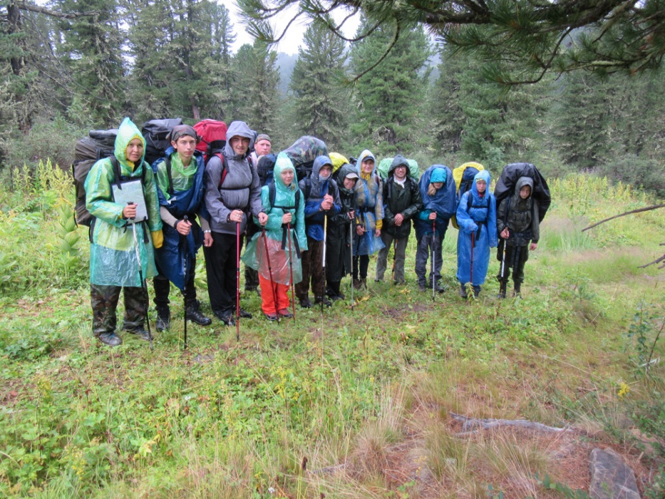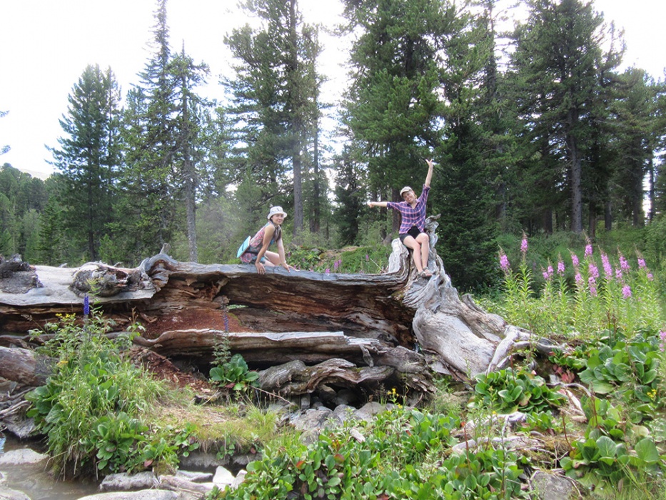 30.07. Четвертый день. Встаём рано, на улице холодно, но очень красиво: солнце, восходя, постепенно озаряет ярким светом холмы, поля, ручей. В 9:30 мы выходим на перевал Айрыкский. Обозначен он тем же способом, что и Аккаинский. С перевала открывается красивый вид на каскад озёр. Насладившись видом, сделав фотографии, спускаемся вниз. Идём по тропе, которая приводит нас к ещё одной интересной достопримечательности — Каракокшенской пещере. Рядом с ней стоянка с оборудованным костровым местом и несколькими поваленными деревьями — идеальное место для обеда. Пока часть группы обедает, остальные идут осматривать пещеру. Начинает моросить дождь. После обеда движемся по тропе, преодолевая многочисленные ручьи, к броду через р. Каракокша. Левый приток, ведущий к верхнему озеру р. Ложа нами не обнаружен и по тропе мы вышли к правому притоку, перешли его вброд и встали под кедрами.