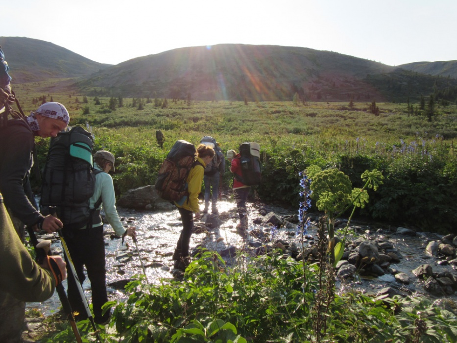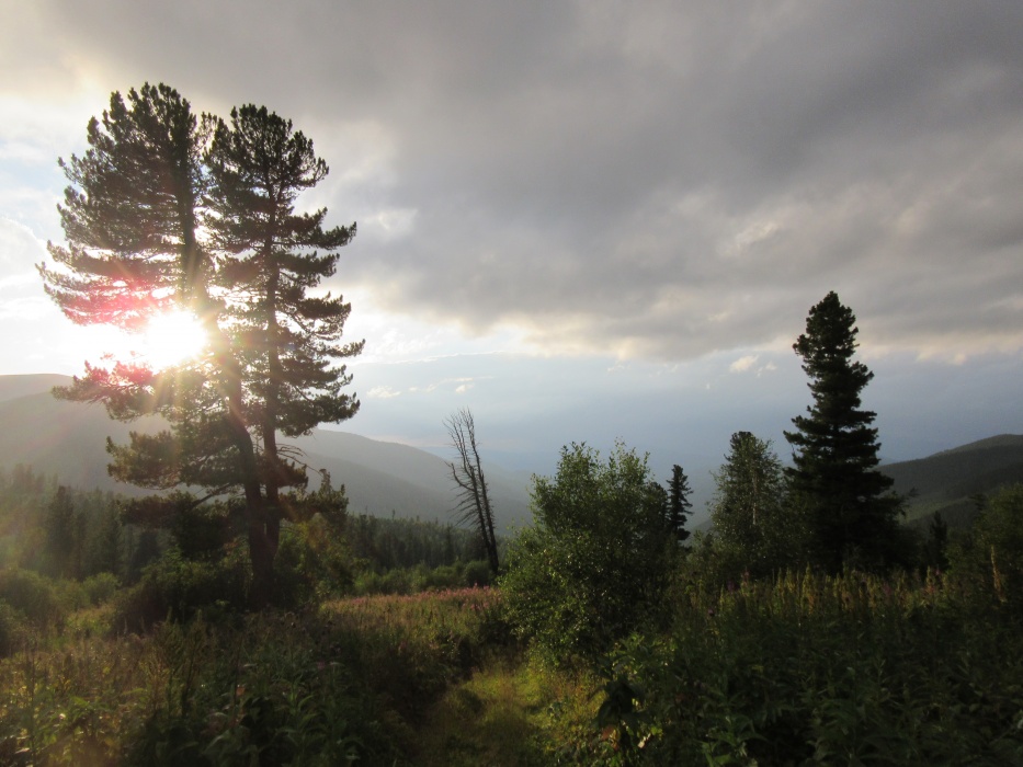 02.08. Так как мы по-прежнему не наверстали отставание от графика, дневку в этот день было решено заменить полудневкой. Отдохнув, намывшись, подремонтировав снаряжение, выдвигаемся в путь. Выходим в 15:40. Переменная облачность. Поднимаемся на перевал в районе г. Ербута и далее. По дороге лакомимся черникой, собираем грибы к ужину, наслаждаемся красивейшим закатом и разнообразием трав и мхов. Но к вечеру тропа уходит не в нашу сторону. Приходится спускаться к р. Елечек по бездорожью по крутому спуску. Снова преодолеваем бурелом, кустарник. Встали в 20:00 на берегу реки.